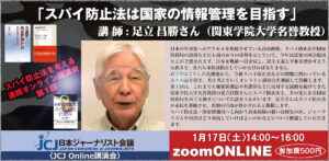 - 〈JCJ Online講演会〉スパイ防止法は国家の情報管理を目指す 講師:足立 昌勝さん(関東学院大学名誉教授)■講演タイトル:【「スパイ防止法を考える」「連続オンライン講演会」「第1回」】 スパイ防止法は国… 続きを読む: 〈JCJ Online講演会〉スパイ防止法は国家の情報管理を目指す 講師:足立 昌勝さん(関東学院大学名誉教授)