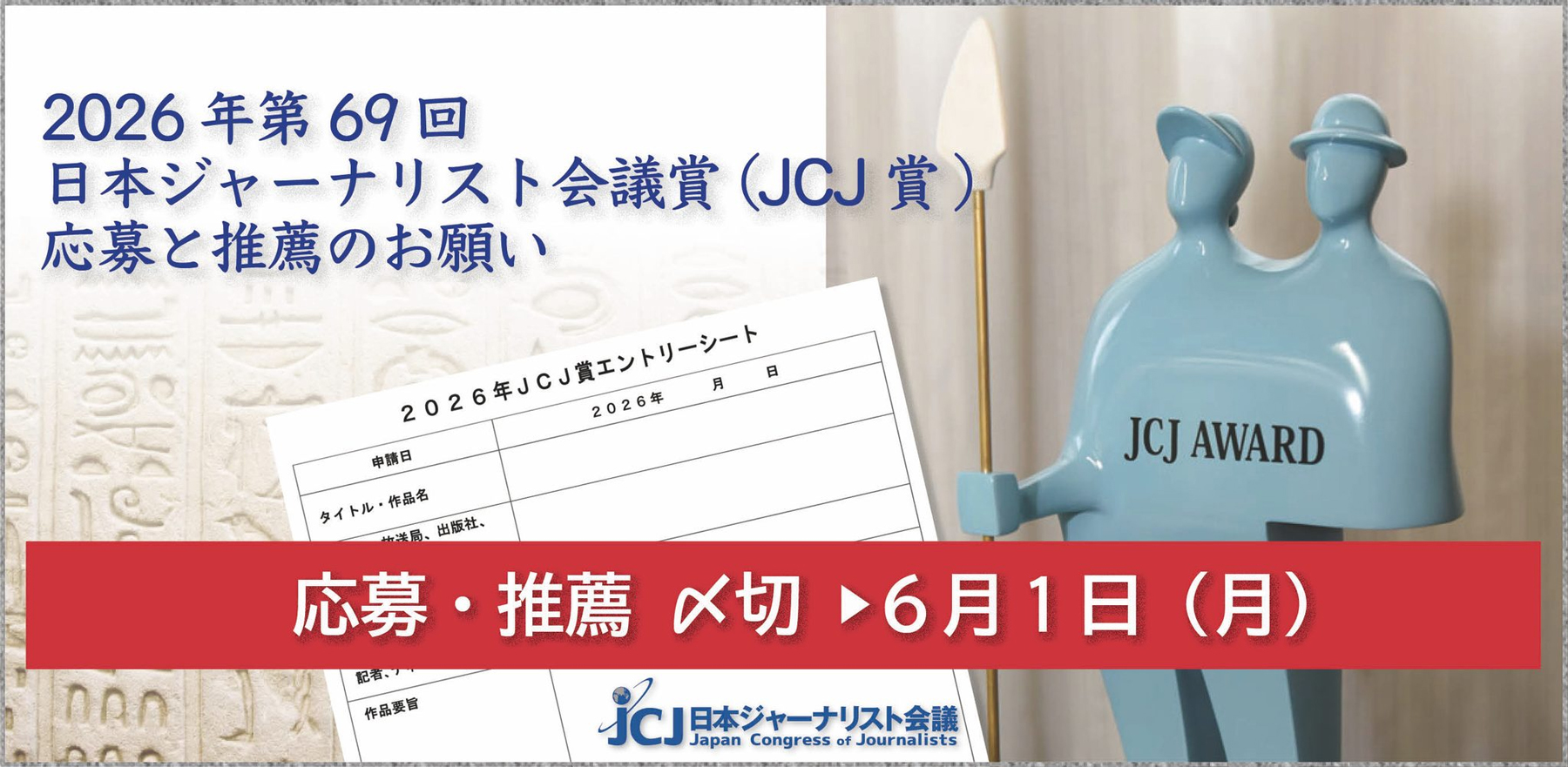- ■2026年第69回日本ジャーナリスト会議賞(JCJ賞) 応募と推薦のお願い日本ジャーナリスト会議(JCJ)は、年間の優れたジャーナリズム活動を顕彰するため、1958年以来「JCJ賞」… 続きを読む: ■2026年第69回日本ジャーナリスト会議賞(JCJ賞) 応募と推薦のお願い