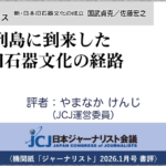 - 〈2026.1月号 書評〉国武 貞克・佐藤 宏之(著)『南回り、北回りの遭遇、列島のホモ・サピエンス──新・日本旧石器文化の成立』・・・日本列島に到来した人類・旧石器文化の経路 評者:やまなか けんじ(JCJ運営委員)本書は、アフリカに起源を持つホモ・サピエンス(現生人類)が日本列島へ到来した足取りをユラシア東方への拡散という壮大な… 続きを読む: 〈2026.1月号 書評〉国武 貞克・佐藤 宏之(著)『南回り、北回りの遭遇、列島のホモ・サピエンス──新・日本旧石器文化の成立』・・・日本列島に到来した人類・旧石器文化の経路 評者:やまなか けんじ(JCJ運営委員)