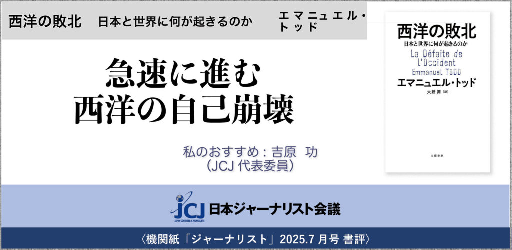〈2025.7月号 緑蔭特集〉エマニュエル・トッド (著)、大野 舞 (翻訳)『西洋の敗北──日本と世界に何が起きるのか』 ・・・急速に進む西洋の自己崩壊 私のおすすめ:吉原 功(JCJ代表委員)