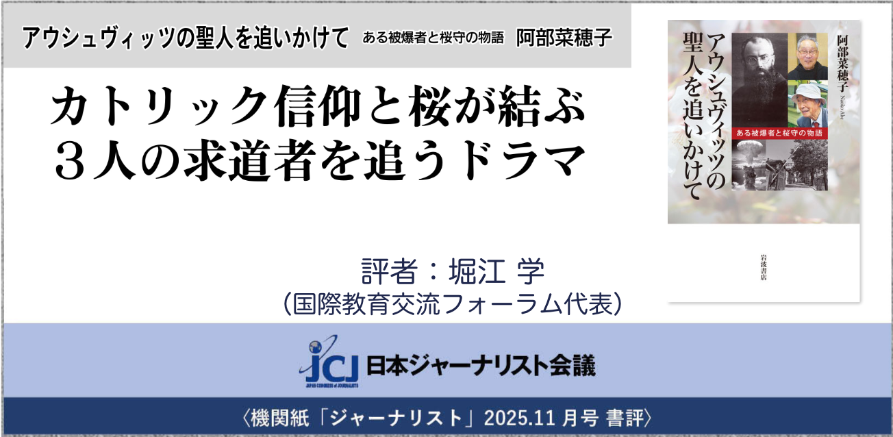 〈2025.11月号 書評〉阿部 菜穂子 (著)『アウシュヴィッツの聖人を追いかけて──ある被爆者と桜守の物語』・・・カトリック信仰と桜が結ぶ3人の求道者を追うドラマ  評者:堀江 学(国際教育交流フオーラム代表)