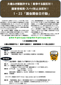 ■大義なき解散許すな!戦争する国反対!──国家情報局・スパイ防止法反対!〈1・23「国会開会日行動」〉 「生活を守り、成長をつくる」と、これまで言ってきた高市首相が、1月23日に召集される通常国会での早期の衆院解散を表明 […]