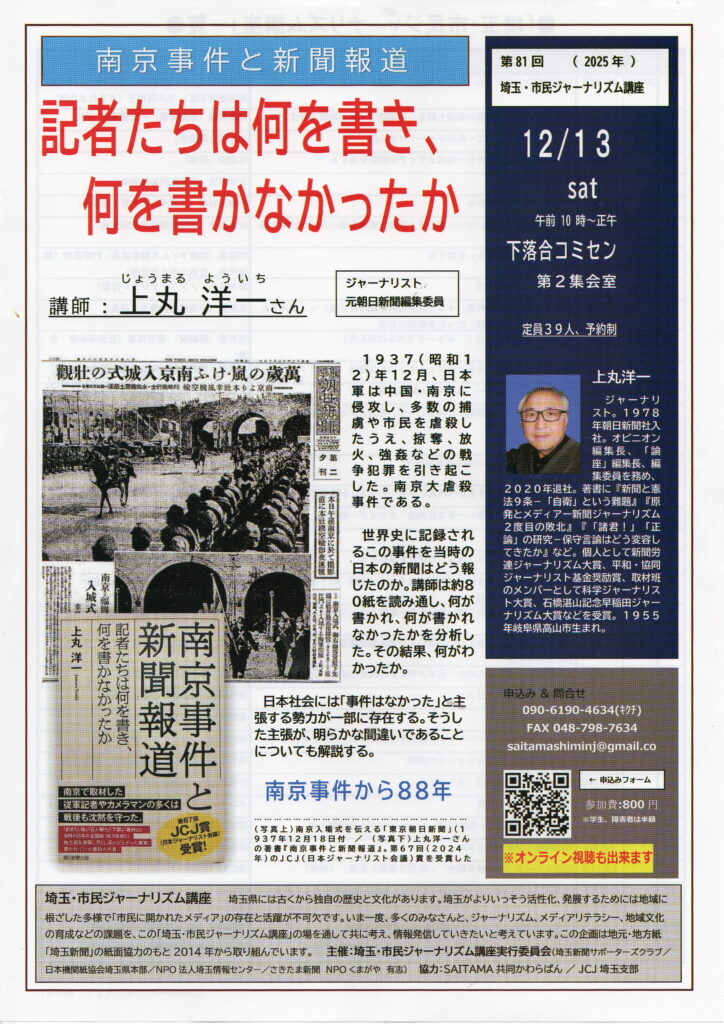 ■第81回 埼玉・市民ジャーナリズム講座講演会 上丸洋一さん 、「南京事件と新聞報道 記者たちは何を書き、何を書かなかったか」(12月13日 (土)10:00〜正午) 於:さいたま市下落合コミュニティセンター 。JCJ会員、菊地正志さんからの案内。