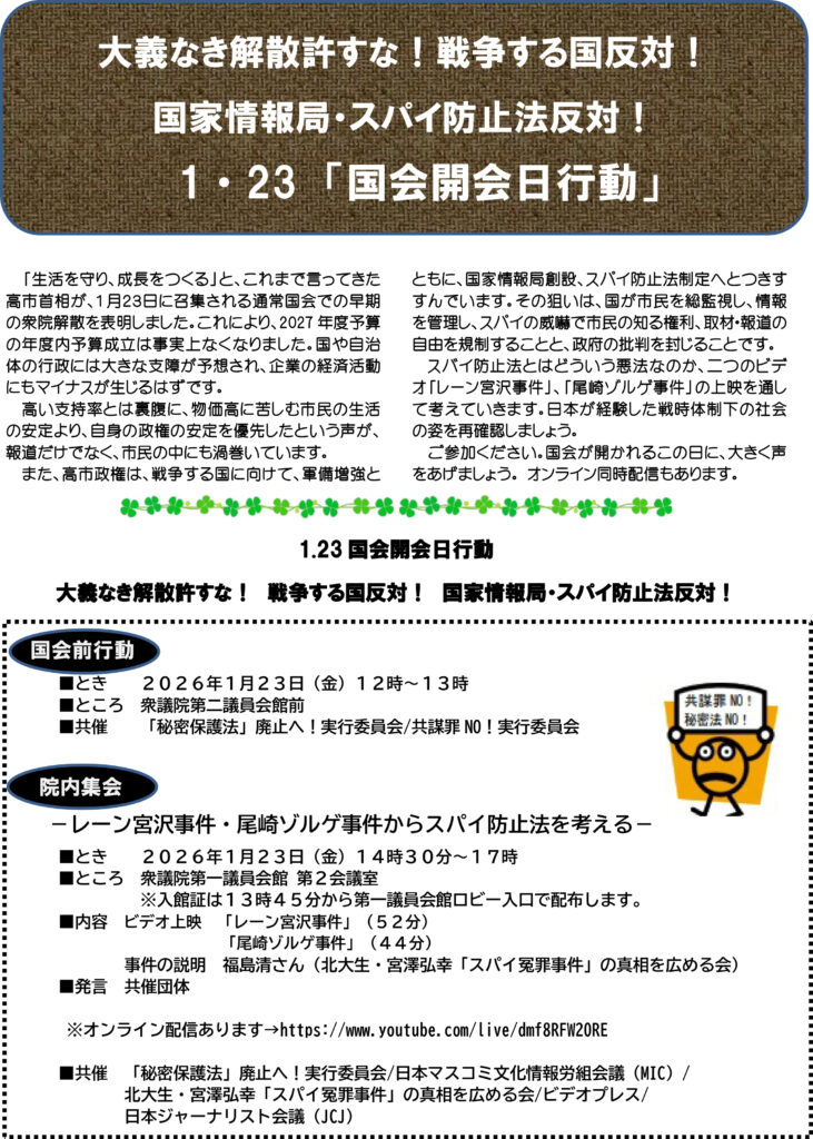 ■〈1・23「国会開会日行動」〉・・・大義なき解散許すな!戦争する国反対!国家情報局・スパイ防止法反対!