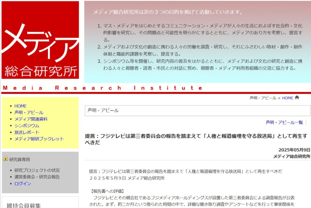 提言:フジテレビは第三者委員会の報告を踏まえて「人権と報道倫理を守る放送局」として再生すべきだ 2025年5月9日 メディア総合研究所