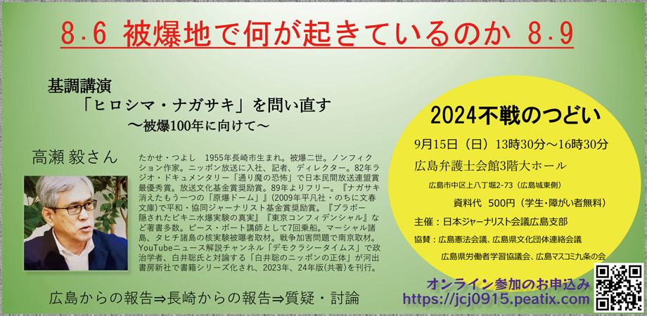 〈JCJ広島支部 2024不戦のつどい〉8・6 被爆地で何が起きているのか 8・9・・・高瀬 毅さん(ジャーナリスト)が講演