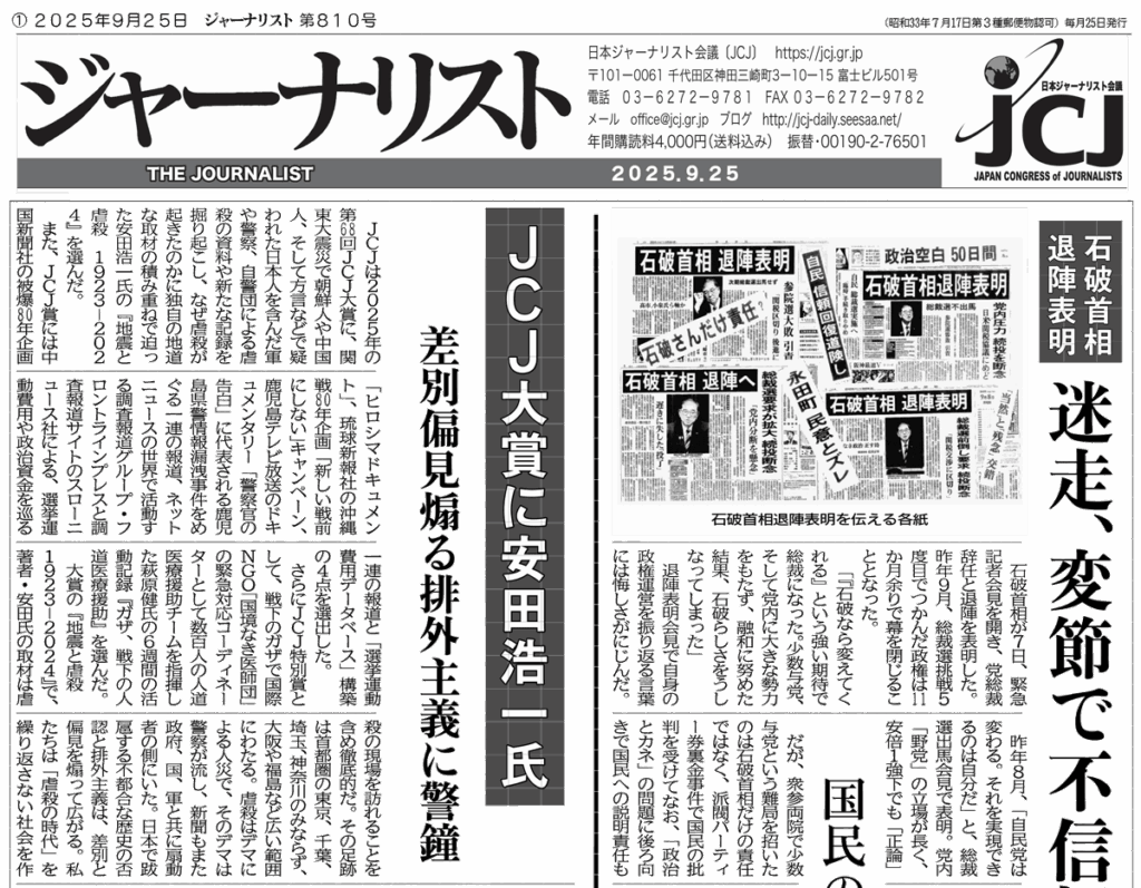 ・JCJ大賞に安田浩一氏・・・差別偏見煽る排外主義に警鐘