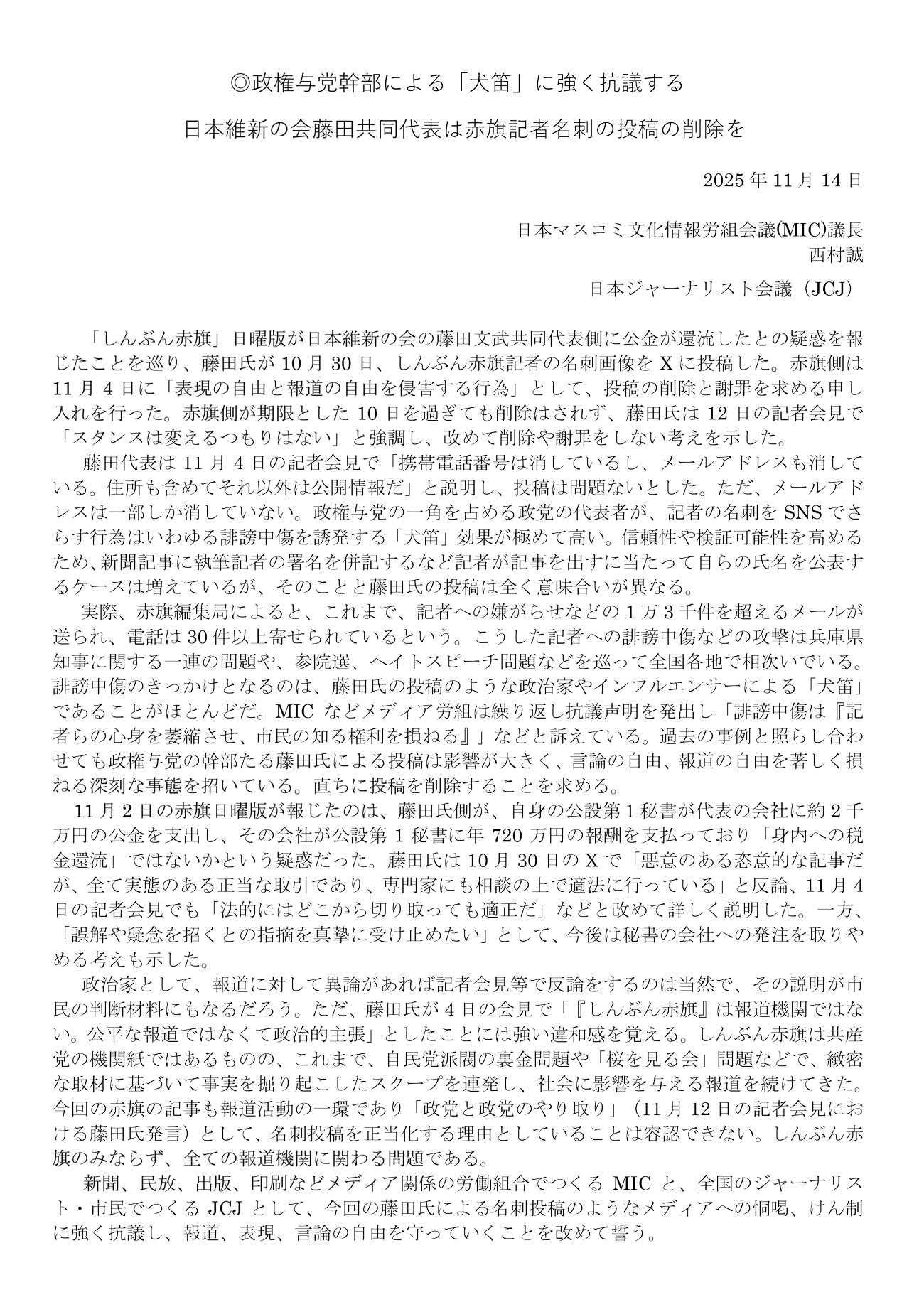 新聞、民放、出版、印刷などメディア関係の労働組合でつくるMICと、全国のジャーナリスト・市民でつくるJCJとして、今回の藤田氏による名刺投稿のようなメディアへの恫喝、けん制に強く抗議し、報道、表現、言論の自由を守っていくことを改めて誓う。