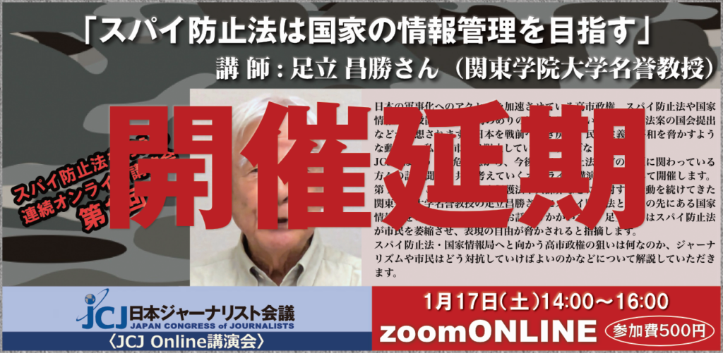 日本の軍事化へのアクセルを加速させている高市政権。スパイ防止法や国家情報局の設置などにも前のめりの姿勢を示していて、今年は法案の国会提出などが予想されます。日本を戦前へ引き戻し、民主主義と平和を脅かすような動きを、私たち市民は阻止していかなければなりません。JCJではこうした危機感から、今後スパイ防止法などの問題に関わっている方々の話を聞き、共に考えていくオンライン講演会を連続して開催します。