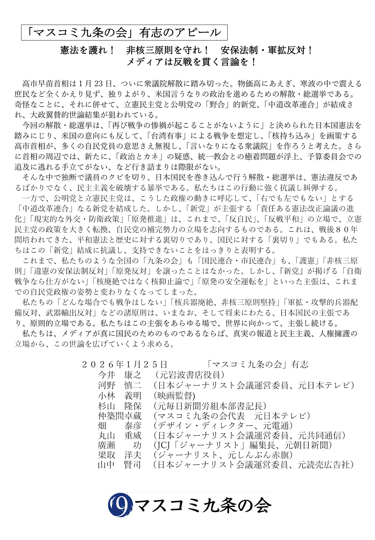 ■■憲法を護れ! 非核三原則を守れ! 安保法制・軍拡反対! メディアは反戦を貫く言論を!──「マスコミ九条の会」有志のアピール(PDFファイル)