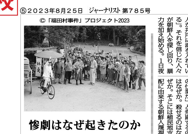 「関東大震災から5日が過ぎた1923年9月6日、千葉県東葛飾郡福田村の利根川沿いで、多くの人が殺された。でもこの事件を知る人はほとんどいない。皆が目をそむけてきた。見て見ないふりをしてきた。惨劇が起きてから9年が過ぎたけれど、事実を知る人はもうほとんどいない」と、森監督は製作した思いを語る。歴史の闇に葬られていた「福田村事件」、100年となる日を公開日とした。(2023年8月25日掲載予定 「ジャーナリスト」第785号)
