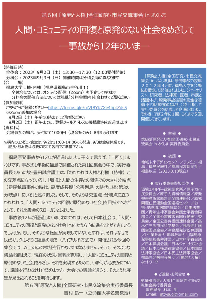 事故後 12 年が経過したいま、われわれは、そして日本社会は、「人間・コミュニティの回復と原発の ない社会」へ向かう方向に進むことができているでしょうか。もし、そのような転回が実現していないと すれば、それはなぜでしょうか。久しぶりに福島の地で(ハイブリッド方式で)開催される今回の集会で は、以上の点の検証を行わなければなりません。そして、そのような議論を踏まえて、現在の状況・困難 を克服し、「人間・コミュニティの回復と原発のない社会」をめざし、それを実現するために、いま何が 必要かについて、議論を行わなければなりません。大会での議論を通じて、そのような展望が見出される ことを期待します。 (実行委員⻑ 吉村良一( 立命館大学名誉教授 )による挨拶文)